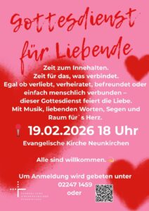Egal ob verliebt, verheiratet, befreundet oder einfach menschlich verbunden – dieser Gottesdienst feiert die Liebe. Mit Musik, liebenden Worten, Segen und Raum für’s Herz.