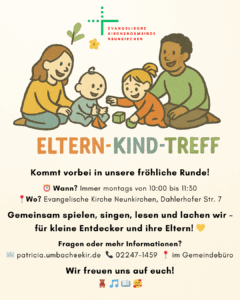 Wir treffen uns immer montags von 10:00 – 11:30 Uhr in der Evangelischen Kirche Neunkirchen (Dahlerhofer Straße 7, 53819 Neunkirchen-Seelscheid).